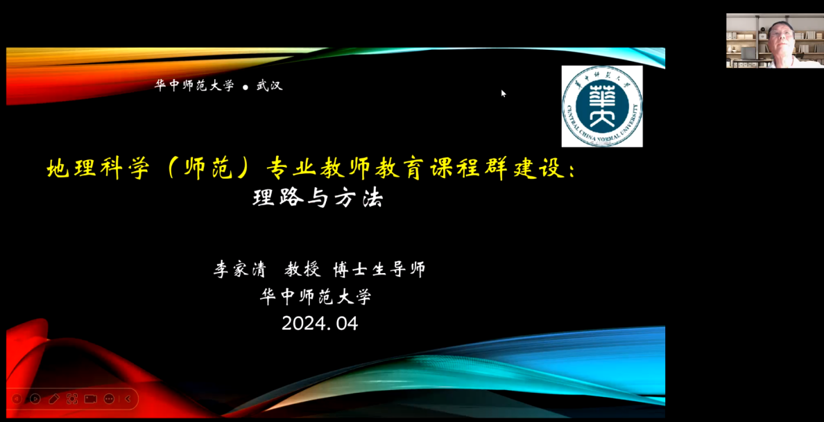 在国家一流课程建设方面,华东师范大学国家地理教材建设重点研究基地主任段玉山教授线上做了《地理师范专业一流课程建设思考》的报告,华中师范大学城市与环境科学学院李家清教授线上做了《地理科学专业(师范)教师教育课程群建设:理路与方法》的报告;北京中教启星科技股份有限公司王秋平教研总监做了《依托技术创新,助力地理科学实验实训课程建设》的报告。