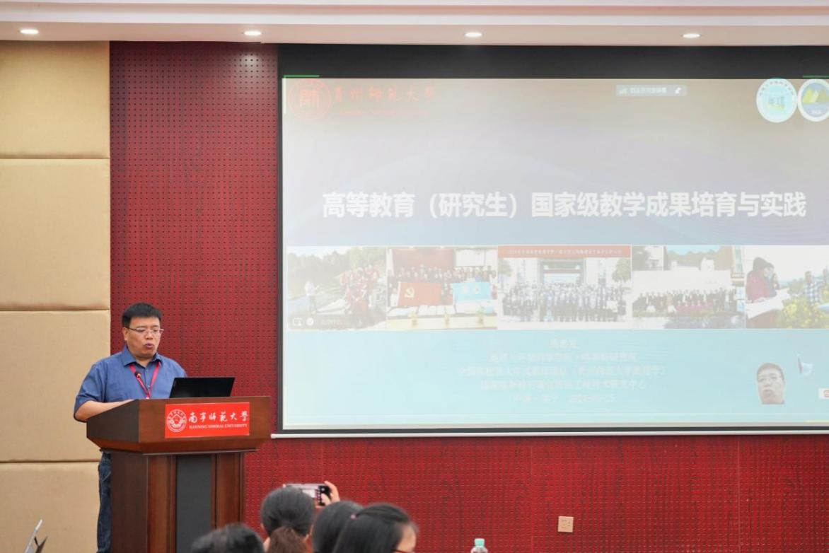 在教育成果奖申报方面,贵州师范大学地理与环境科学学院院长周忠发教授做了《高等教育国家级教学成果培育与实践》的报告。
