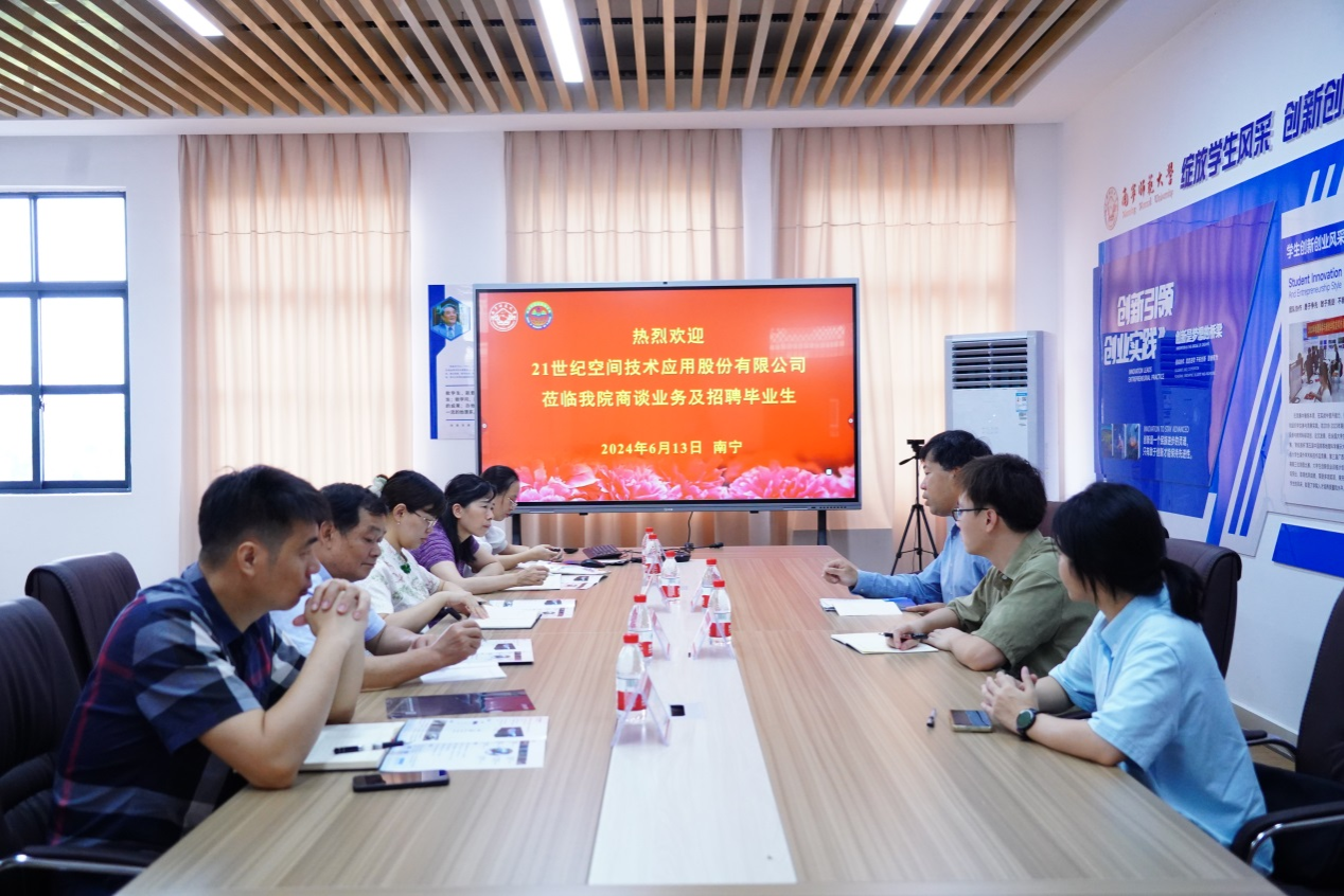 为了更好地拓宽一色 学生的实习及就业渠道,帮助毕业生实现充分、高质量就业,6月14日,学院邀请二十一世纪空间技术应用股份有限公司到学院宣讲招聘,南宁世纪空间技术应用有限公司市场经理王井英,广西世纪空间科教信息技术服务有限公司副总经理、星耀南宁科学馆馆长黄俊和售前技术经理黄晨琦负责此次招聘工作,学院相关领导、教师代表和应聘毕业生参加活动。