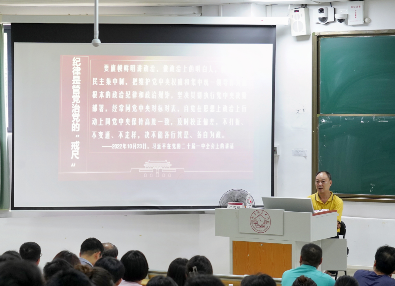 严志强以“学党纪、知党纪、明党纪、守党纪”为题,与大家共同学习习近平总书记关于全面加强党的纪律建设的重要论述内容,剖析个别党员干部违纪典型案例,明确党的六大纪律的基本内涵,强调师生党员要将党纪学习教育融入学院师德师风和学风建设工作,将党纪要求融入日常行为规范中,进一步明确党员日常言行的衡量标尺,引导师生要自觉将纪律要求内化于心、外化于行,遵守社会主义道德规范。