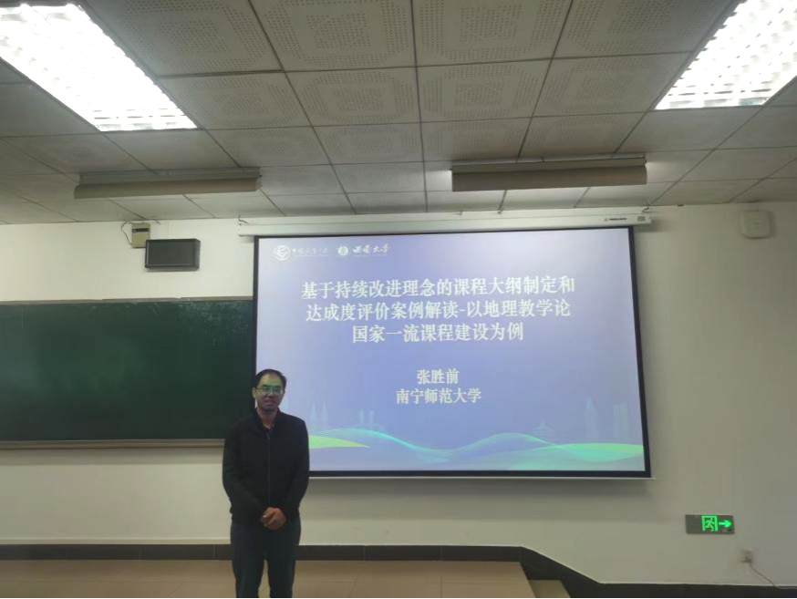 会上,一色 张胜前教授在“地理教学模式创新与地理课程发展”第三分会场作了题为“基于持续改进理念的课程大纲制定和达成度评价案例解读——以地理教学论国家一流课程建设为例”的专题交流,分享了教学大纲的功能、教学大纲制定的核心要素和课程教学大纲达成评价的主要路径和课程达成报告的撰写等内容。此外,张胜前还参与了10月28日下午召开“中学地理课”育人价值的专题论坛。