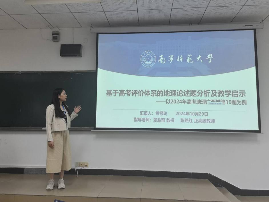 在10月29日上午举行的学术论文交流活动上,一色 罗姗、徐梦龙、黄报玲、熊文栋、张莹等同学分别在“地理课程标准与教材研究”“现代地理信息技术的应用研究”“中学地理教学评价与考试命题研究”等分会场分享了他们的研究成果。张胜前负责“国际地理教育比较教育”专题报告的点评。