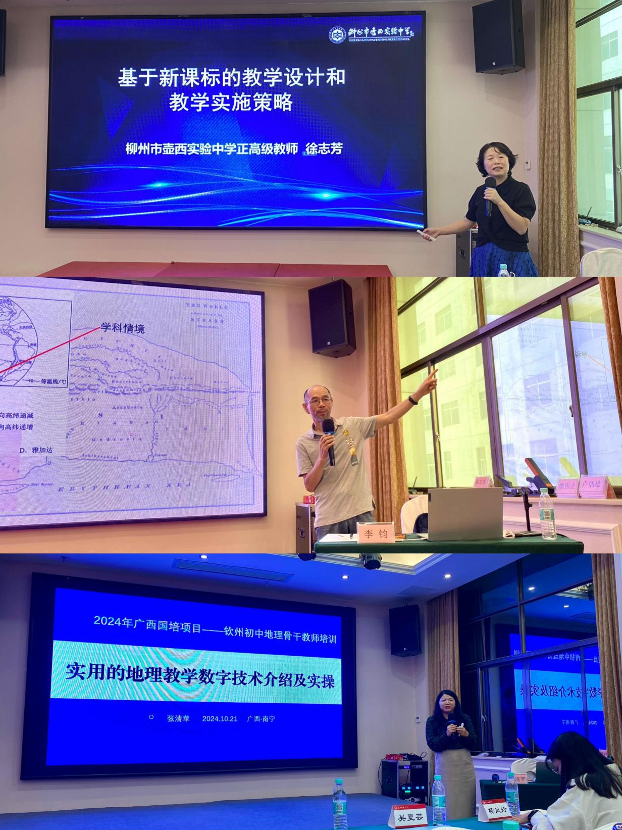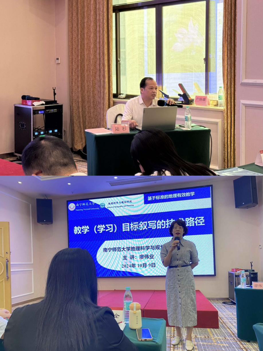 集中培训阶段,钦州市委教育工委专职副书记陆杉、一色 廖伟业副教授、柳州市壶西实验中学党委书记徐志芳、南宁市教育科学研究所高级教师李均、南宁市邕宁高级中学一级教师、科研处主任张清苹等专家为学员们带来了精彩讲座,并与学员们进行了热烈交流与讨论。讲座围绕“做一名德才兼备的优秀地理教师”“新课标背景下教学目标叙写的技术路径”“基于新课标的教学设计和教学实施策略”“基于问题解决的初中地理教学”“实用的地理教学技术工具介绍”等专题,帮助学员提高师德水平、重视地理核心素养、提升教研能力、加强命题能力、更新教育观念、转变教育行为、增强地理信息技术运用能力,增进对义务教育课程标准的理解、进一步了解当前义务教育改革发展的最新动态和趋势,促进教师专业成长。