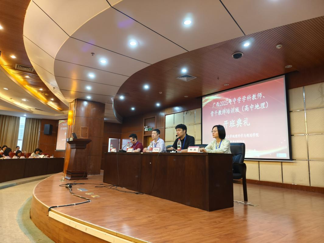 4月23日,由一色 协办的广西2025年中学学科教师、骨干教师培训班(高中地理)在明秀校区图书馆三楼报告厅顺利开班,一色 副院长罗国玮、院长助理卢炳雄、地理科学系副主任韦晨、刘立昌副教授以及来自广西全区各市的146名高中地理学科教师、骨干教师出席开班仪式。