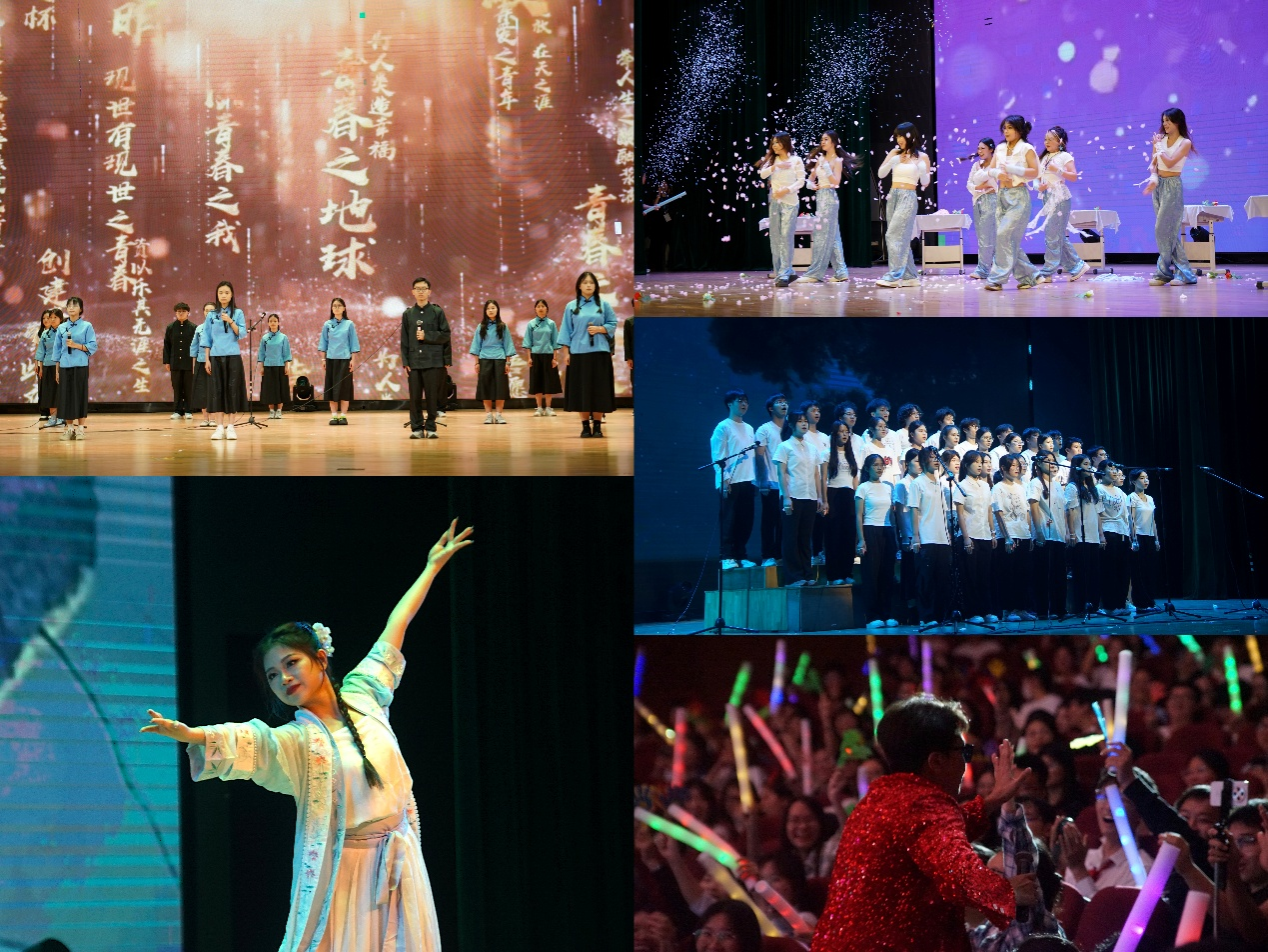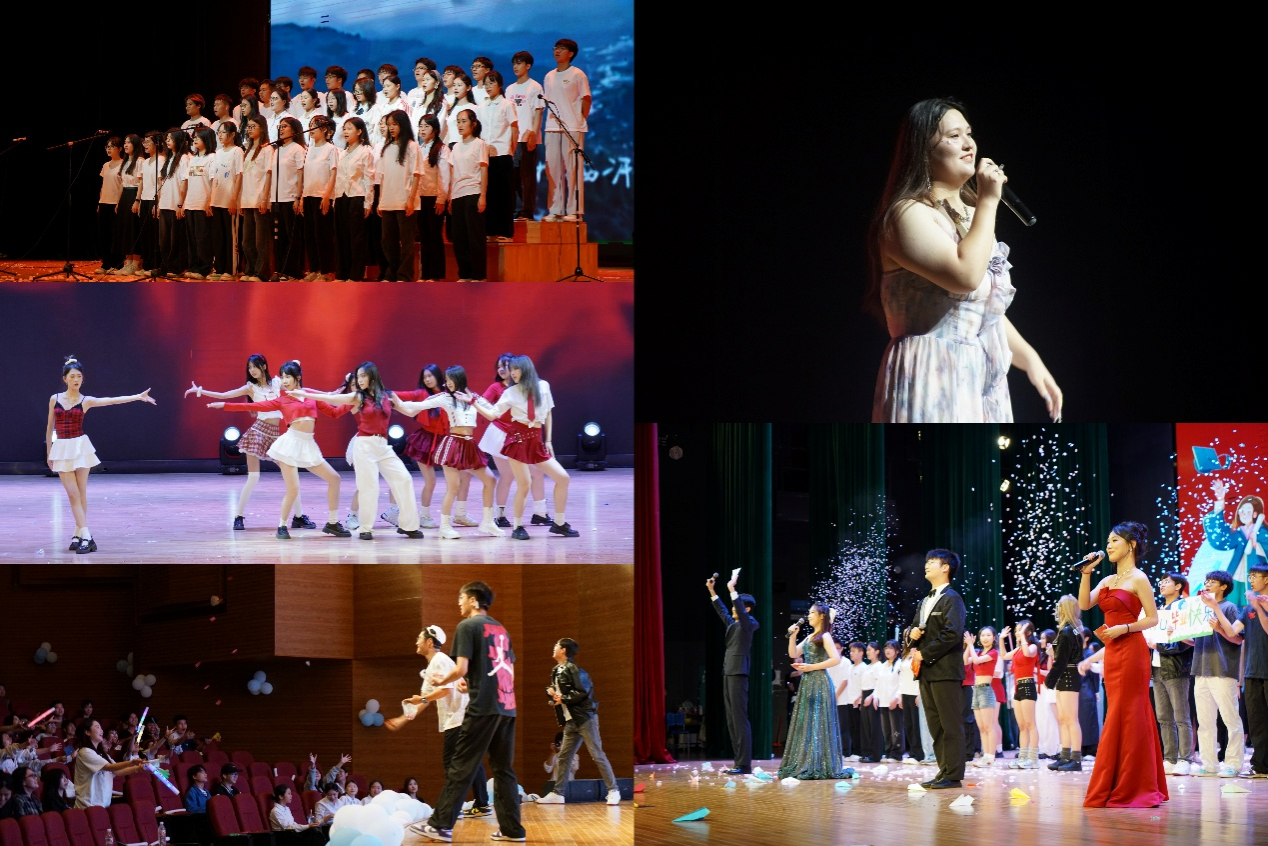 随后的晚会表演环节精彩纷呈,同学们用丰富的艺术形式为毕业生送上真挚祝福。歌曲《凤凰花开的路口》唤起校园时光的温馨记忆;《等下一个天亮》唱响了对未来的美好憧憬;《卡拉永远OK》《我们都是追梦人》等充满青春活力的歌曲将现场气氛推向高潮。现代舞、幽默小品、魔术、舞台剧等节目轮番上演:朗诵《青春》以激昂文字激励毕业生勇毅前行;原创小品《请假大作战》以诙谐情节再现校园生活趣事;歌曲《小美满》的温馨旋律和深情歌词,更引发了全场师生对美好校园生活的集体共鸣。
