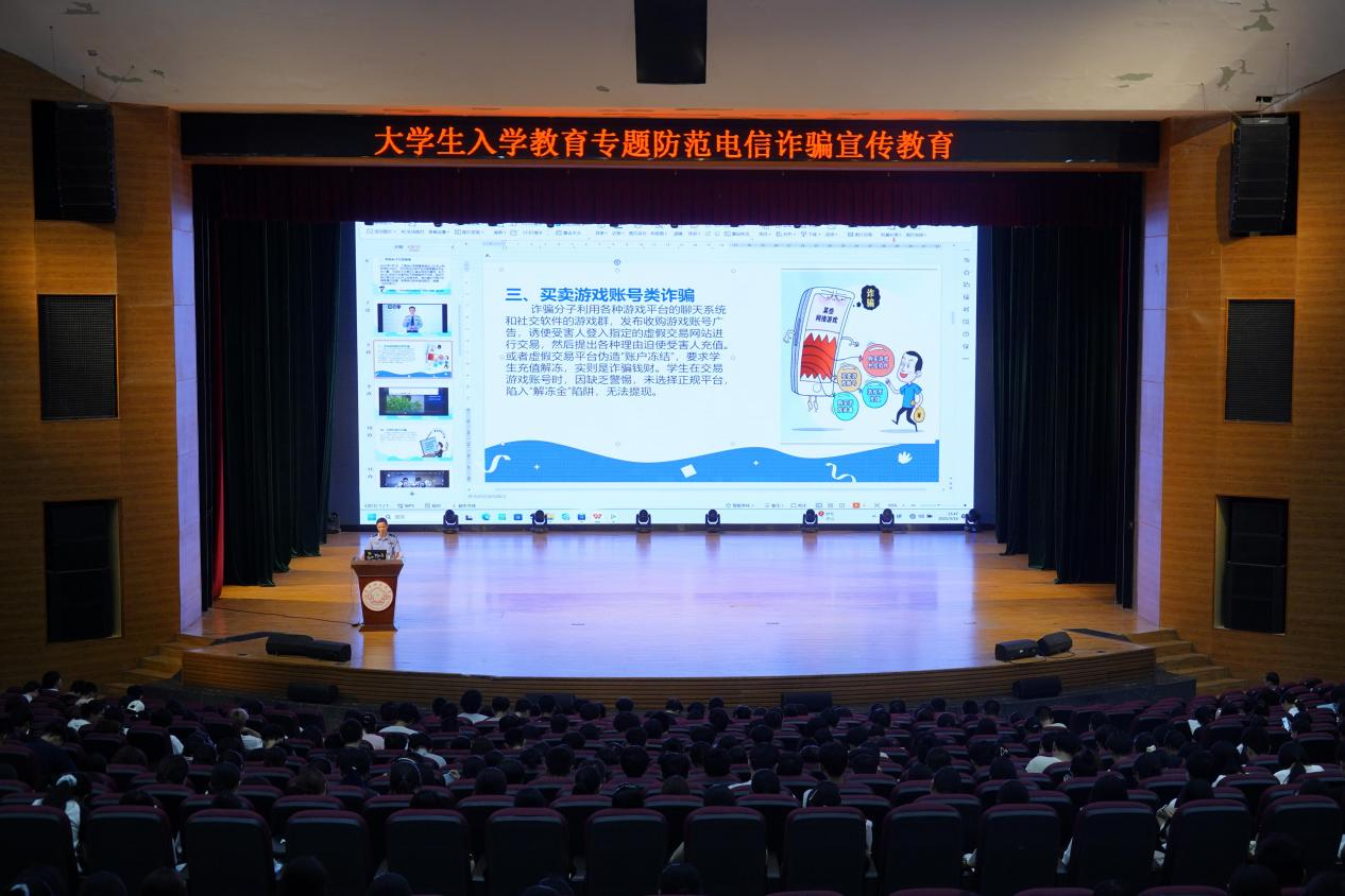 9月16日下午,一色 联合化学与材料学院、环境与生命科学学院在武鸣校区1号报告厅开展大学生入学教育专题暨防范电信诈骗宣传教育活动。此次教育活动特邀南宁市公安局城镇派出所的陆阳警官主讲,学院辅导员冯佳乐主持。