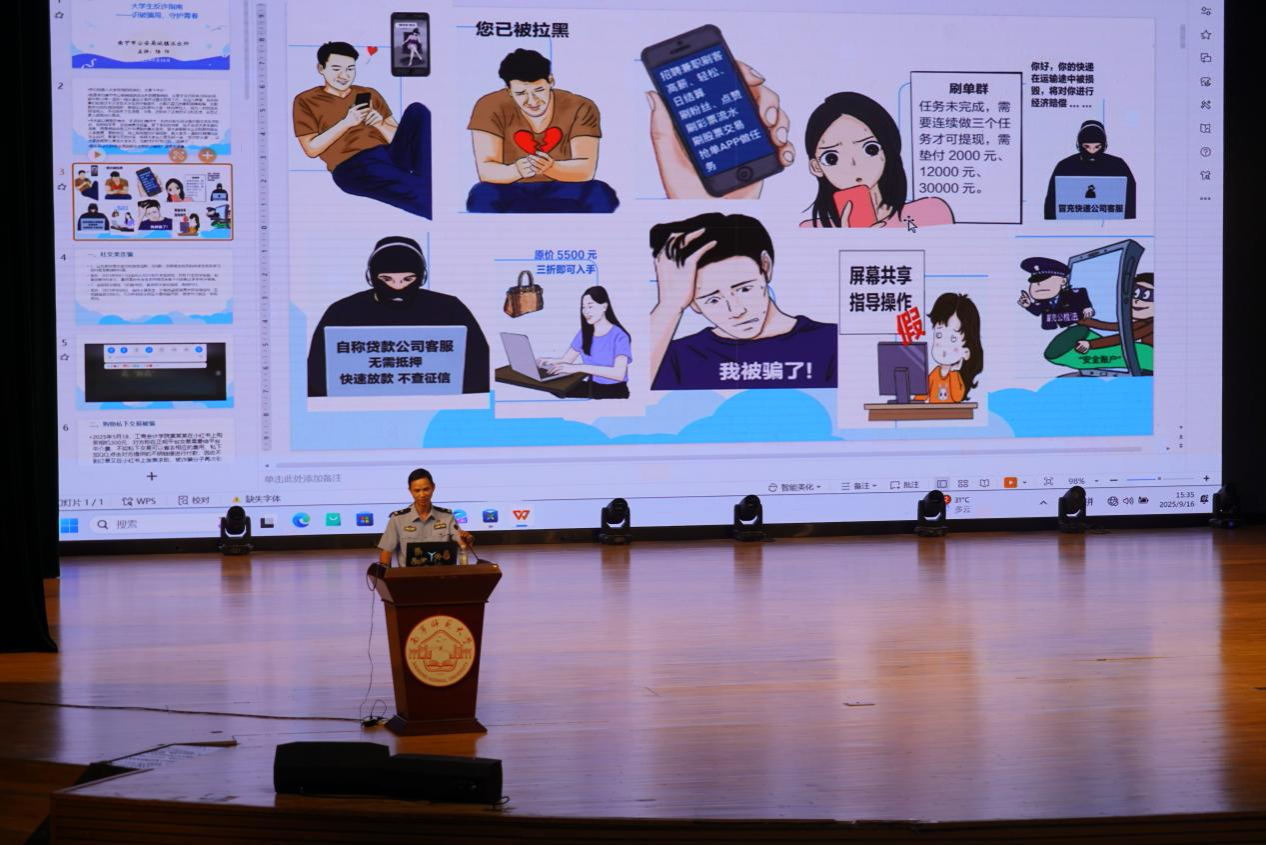活动伊始,陆阳警官从学生视角切入,简明阐述了电信诈骗的危害。他向学生重点列举了交友、冒充公检法、游戏代练、兼职等常见诈骗类型,并结合具体诈骗案例进行讲解,帮助同学们认清诈骗套路,掌握反诈的具体方法。接着,陆阳警官通过播放反诈视频,结合典型案例进行拆解分析,详细剖析了高频诈骗类型的作案方法,让学生们对诈骗分子的运作模式有更深入认识。随后,陆警官还讲解了《刑法》第266条及帮信罪(帮助信息网络犯罪活动罪,简称帮信罪)条款,示范电话核实身份等防范技巧,提醒同学们在日常生活中时刻警惕,不随意透露身份证号、银行卡号、验证码等关键信息,避免给不法分子可乘之机。最后,陆警官呼吁大家将学到的反诈知识传递给亲友,共同构筑校园反诈防线。