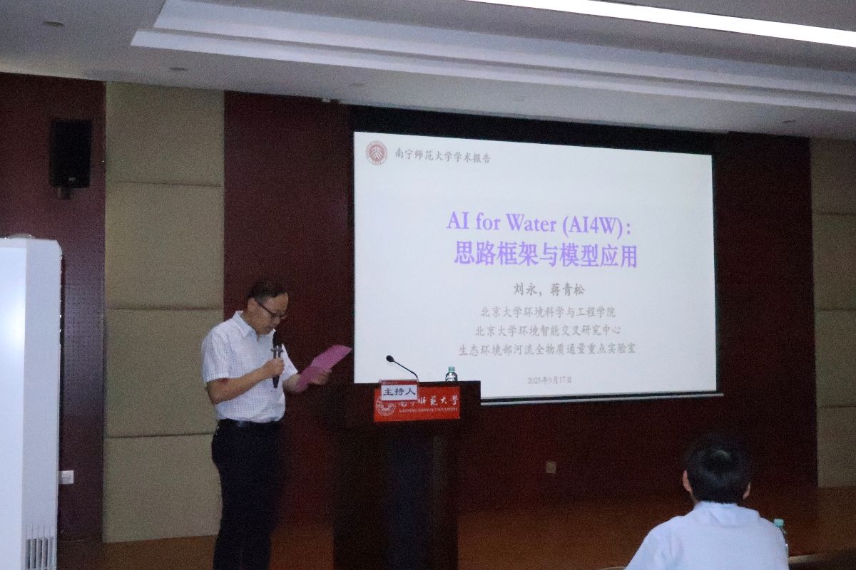 会议伊始,赵银军副院长首先对刘永教授的莅临表示诚挚欢迎。随后,刘永教授作了以“AI for Water (AI4W):思路框架与模型应用”为题的学术报告,系统介绍了当前水环境研究中常用的人工智能模型,及其在高分辨率污染源排放清单构建、河湖生态补水动态优化调度等领域的实际应用案例。结合科研团队在实地研究中遇到的挑战,他深入剖析了当前AI技术存在的局限,特别是数据质量与模型可解释性对预测准确性的制约,并分享了通过构建和训练AI模型以推动水环境研究进展的经验与思考。刘永教授指出,AI技术在处理复杂水文过程时表现出显著的高效性和扩展性,但其进一步发展仍依赖于数据、模型与算力三大核心支柱。他强调,未来应重点推进高质量数据的整合与共享、加强机理与数据融合的建模方法研究,并持续提升计算支撑能力,从而推动人工智能技术在水环境领域实现更深入、更广泛的应用。