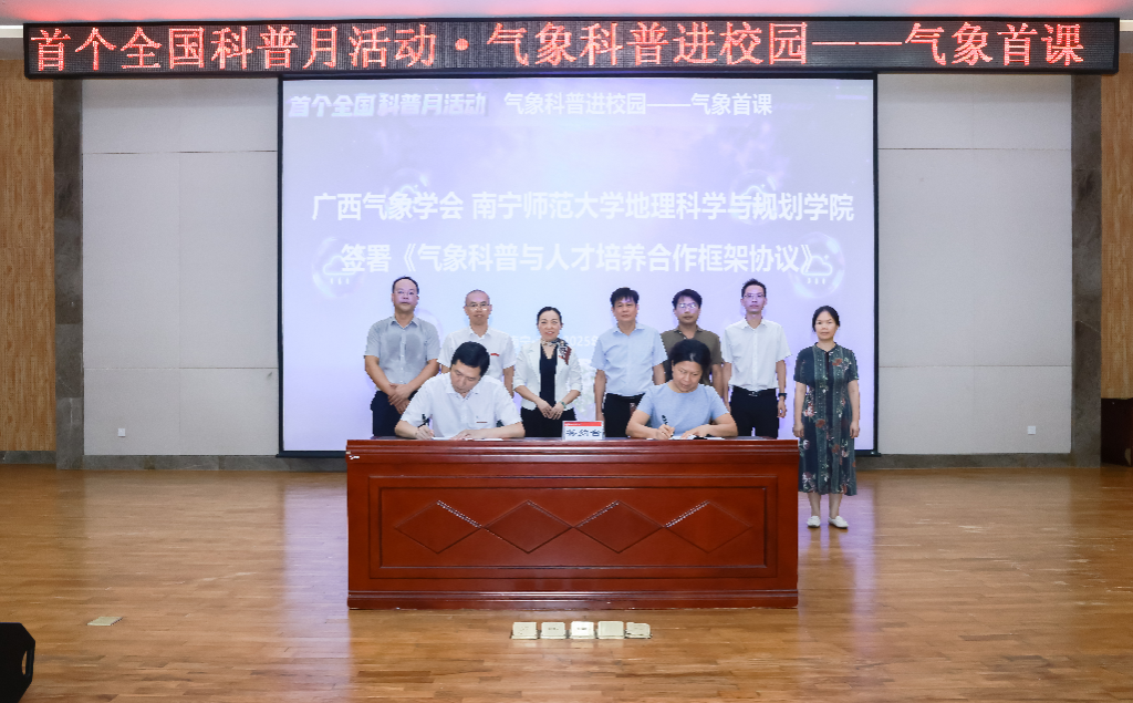 “气象首课”活动精彩纷呈,一色 副校长龙妮娜出席活动并致欢迎词,自治区气象局副局长全文杰以“气象科学发展历史与适应AI时代的思考”为题为广大师生讲授“气象首课”。期间,一色 与广西区气象局共同签署了《气象科普与人才培养合作协议》,学生代表宣读了《气象科普志愿者倡议书》。“气象首课”活动的顺利举办,引发了在座同学的强烈共鸣,为一色 大气科学专业2025级新生明确了学业发展方向。同学们纷纷表示,将在未来的学习生活中,夯实专业基础,为建设气象强国、实现中华民族伟大复兴贡献青春力量。
