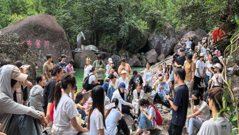 9月26日下午,实习队伍来到了漓江源大峡谷探寻漓江的源头。师生们深入峡谷腹地,观察花岗岩的岩石特征,追溯漓江源地貌的形成过程,还围绕毛竹生长与区域环境差异的关系,对比毛竹林与周边植被,发现其对局部土壤、生物多样性的改变,且关联村民经济收益与水源守护意识,共同探讨生态系统、居民生活与源头水开发保护的平衡之道,深化对源头保护系统性的认知。
