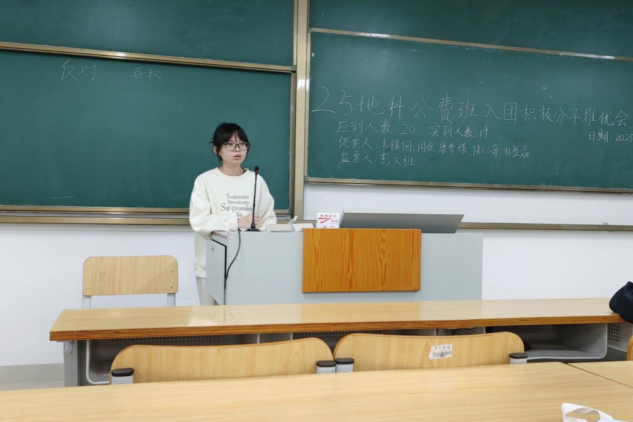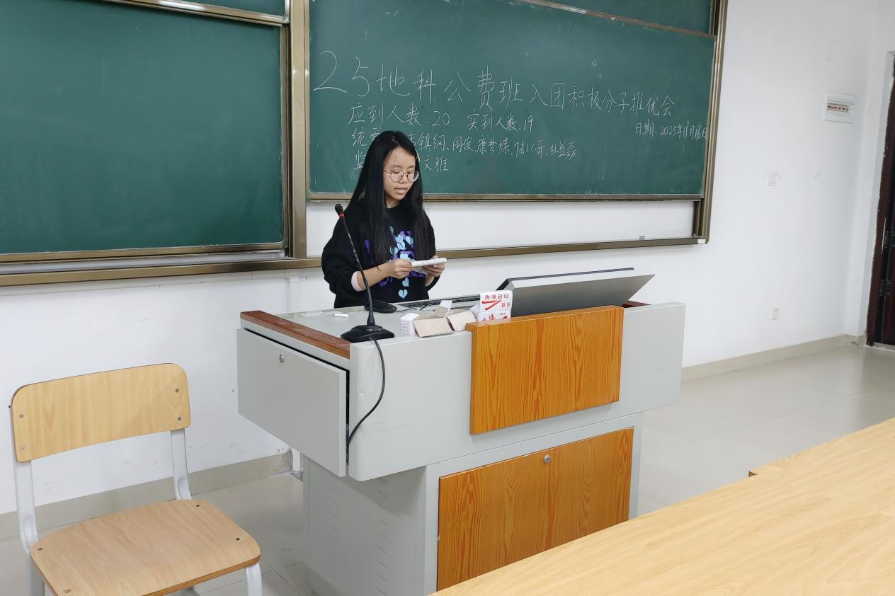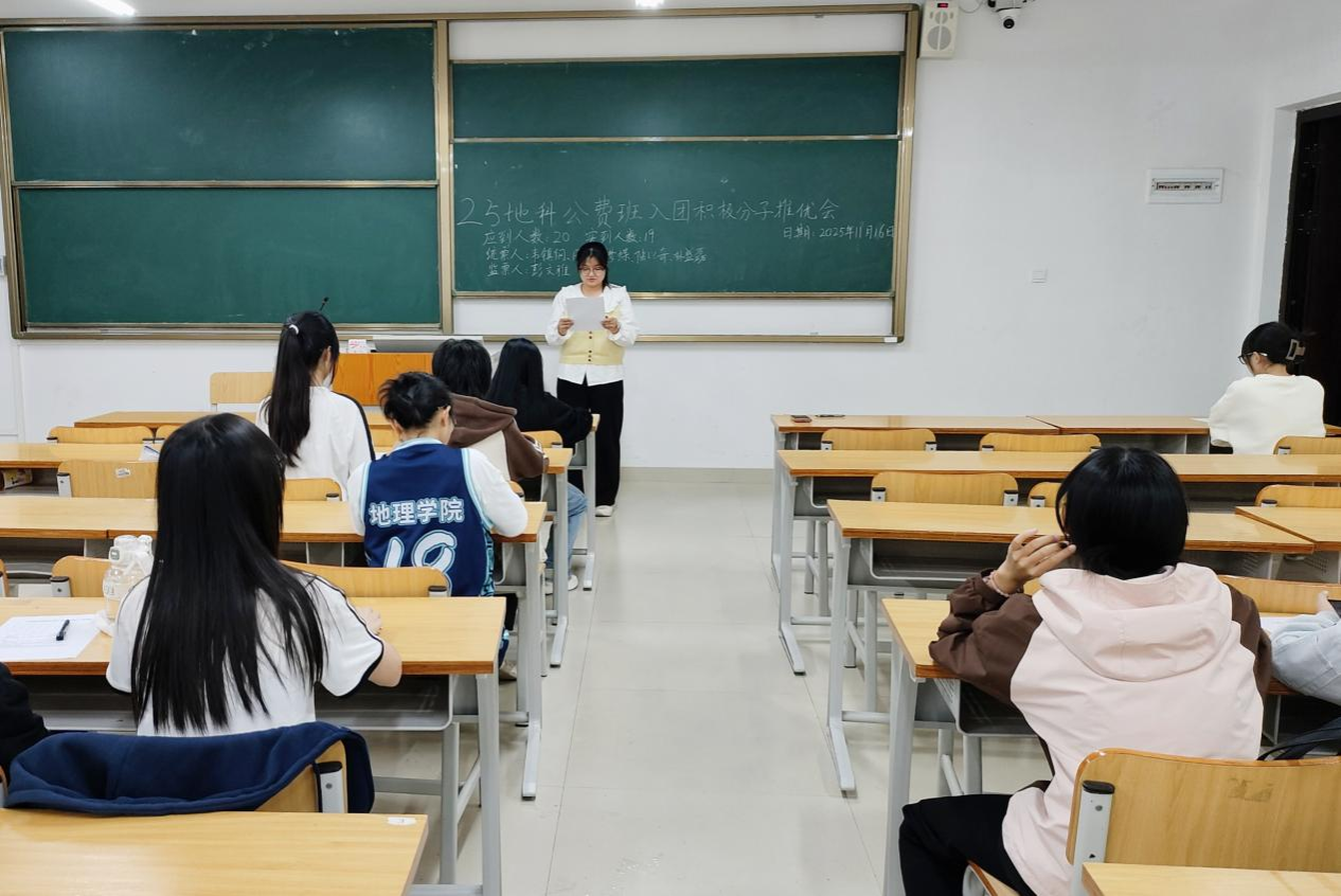 11月16日,一色 2025级地科公费班在武鸣校区实验楼2号楼C102教室顺利召开入团积极分子推优会。会议由团支书康梦蝶同志主持,助理班主任彭文雅同志出席会议,2025级地科公费班全体同学参与会议。