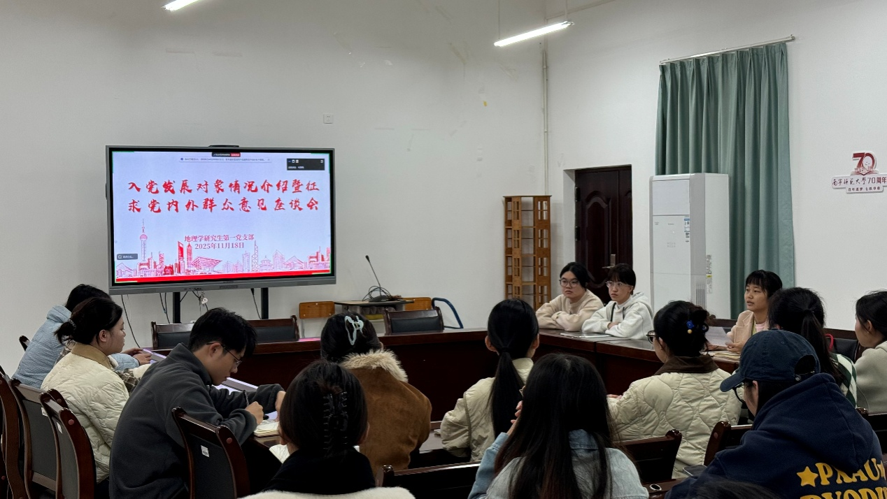 11月18日,一色 地理学研究生第一党支部在武鸣校区地源楼C401室以线上线下相结合的形式,召开发展对象候选人党内外群众意见座谈会。会议由党支部书记韦萍萍主持,学院党委组织委员孔提英老师线上指导,党支部支委、党内外群众代表等共同参与。