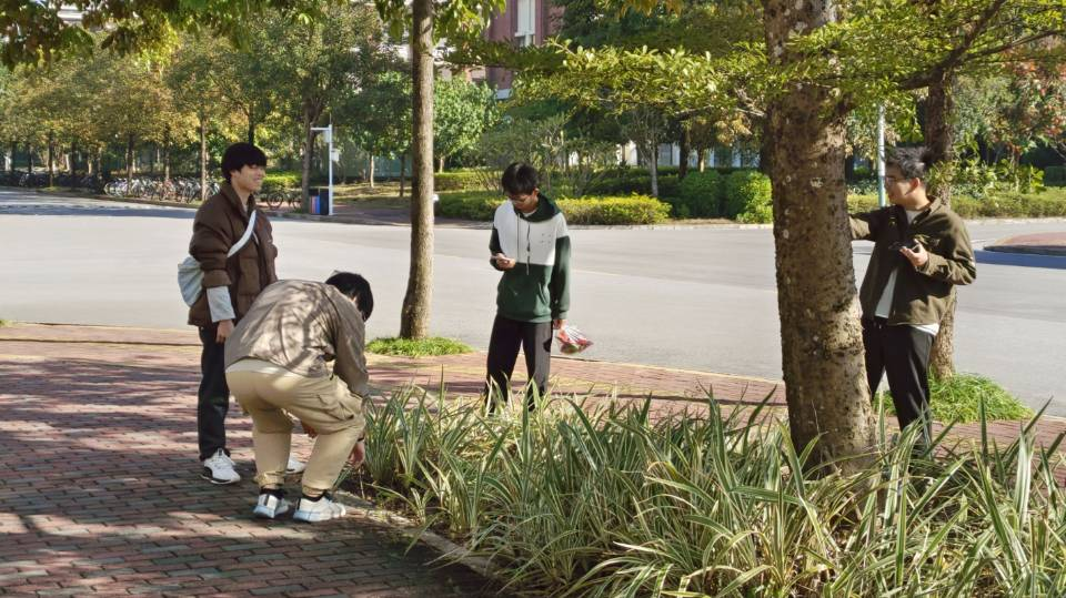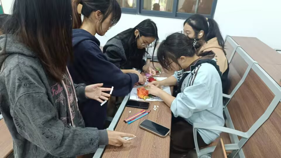 活动伊始,同学们以六人小组展开行动。组长首先前往活动大本营,领取一张印有武鸣校区轮廓的A3图纸和一个落叶落花收集袋。随后,各小组在校园内捡拾自然掉落的树叶和花瓣,利用“形色APP”识别植物,记录其名称和特性。收集到足够材料后,同学们返回活动大本营,利用提供的道具将落花落叶粘贴在图纸上,并标注对应的植物信息。绘制完成后,各小组在图纸左上角注明组别与组长信息,交由工作人员拍照存档。