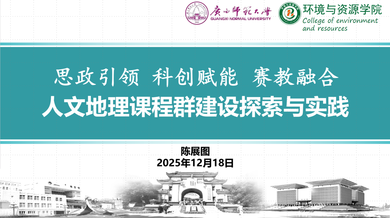 广西师范大学陈展图副院长以《思政引领科创赋能赛教融合——人文地理课程群建设探索与实践》为题,介绍了该校人文地理课程教师团队和人文地理课程群建设概况。他通过典型案例,分享了在思政引领、课程内容优化、线上与智慧课程建设、地理实践力培养、科研赋能和赛教融合等方面的具体做法,以及在教学研究、课程建设与学生发展取得的成效,最后从课程团队组织、教学内涵和内容建设等方面提出了未来改进方向。