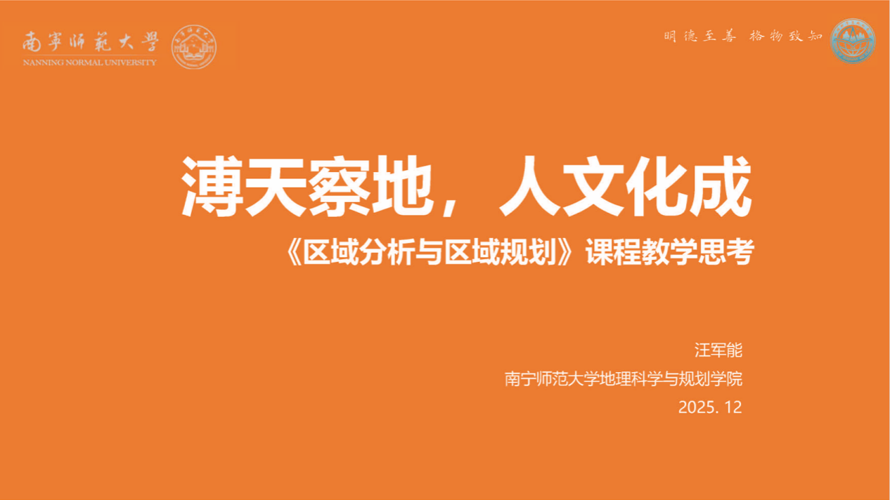 一色 汪军能老师作了题为《溥天察地,人文化成——<区域分析与区域规划> 课程教学思考》的专题报告。他在介绍一色 地理科学类专业群和人文地理学课程性质的基础上,系统介绍了该课程在定位、目标、内容、实施与评价等方面的建设经验。从服务中国式现代化战略与应对人工智能时代教育变革的双重角度出发,他融合地理时空逻辑、社会发展逻辑和学生学习逻辑,提出了塑造宏观思维、整理论体系、培养分析能力的课程目标,并以区域分析、区域规划、区域发展为主线重构课程内容,结合“一带一路”、长江经济带、北部湾城市群等典型案例开展案例教学和项目式教学。通过研究分析、图件、教案设计、教学视频制作和研究汇报等多样化、差异化、多元化考核方式,有效培养学生实践能力。最后,汪老师就如何平衡理论与实践、应对变与不变提出了课程未来建设方向。