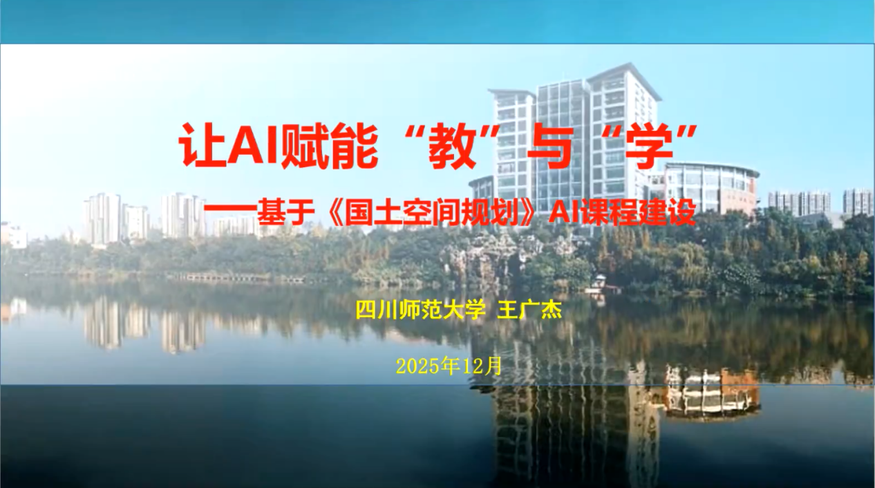 四川师范大学王广杰副院长作了题为《让AI赋能“教”与“学”——基于《国土空间规划》AI课程建设》的报告,他在介绍了人工智能技术发展和教育教学应用需求的基础上,重点分析了智能学习系统、自适应学习、个性化学习和智能评估与反馈等AI教育应用场景,并以《乡村地理与村镇规划》《国土空间规划理论与实践》两门课程为例,详细阐述了知识图谱、能力图谱、问题图谱和素质图谱的构建方法,通过典型案例展示了智能学伴、智能备课、智能批改等AI教学工具的应用效果,并强调了个性化教学与学情分析的重要性。