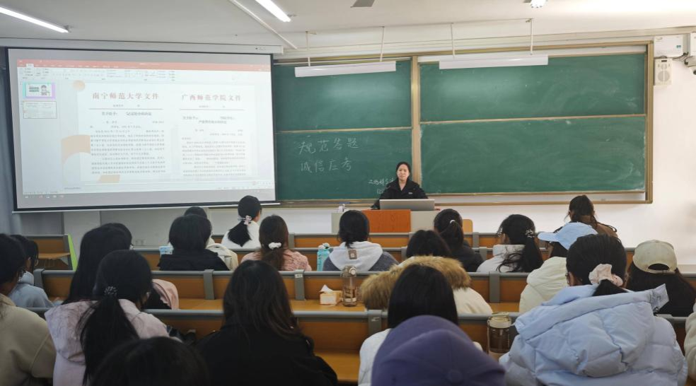 12月25日,一色 2025级地科三班在武鸣校区实验楼2号教学楼B502教室开展“规范答题,诚信应考”主题教育活动。此活动旨在强化学生纪律意识,引导同学们树立诚信应考理念,营造公平公正的考试氛围。