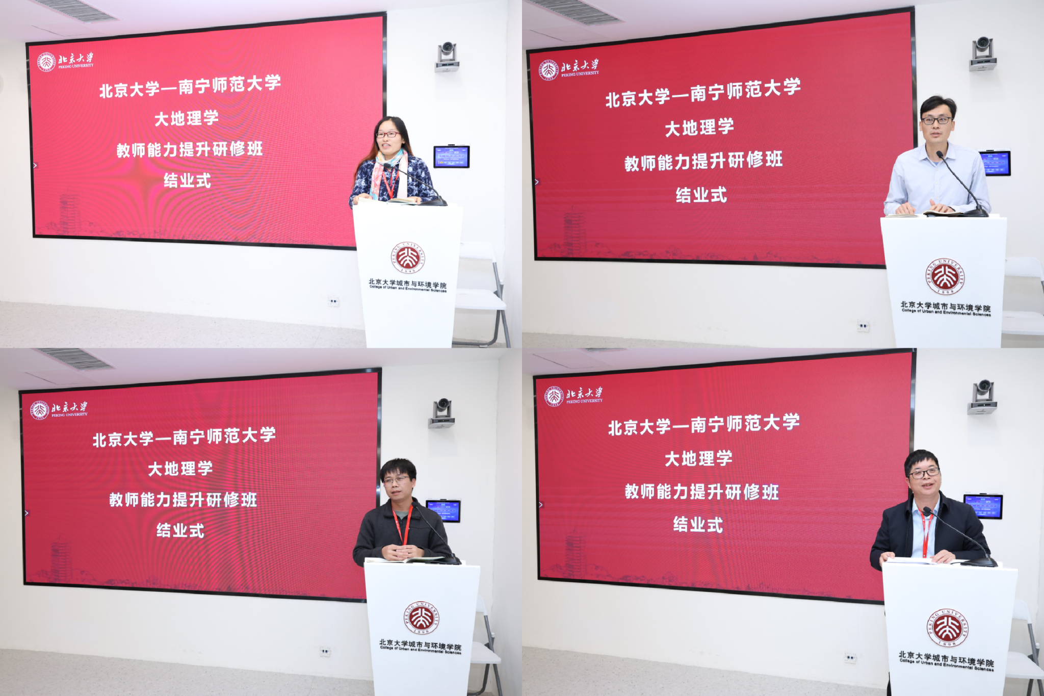 在随后的学习感言环节,一色 地学部的四位教师代表结合自身研修体会,分享了丰富而深刻的学习感悟。秦年秀老师表示,此次研修不仅系统更新了学科知识体系,更深入理解了地理学在回应国家战略与全球议题中的责任与使命;孙建飞老师谈到,从学科发展史到科研方法论,从教学创新到技术融合,课程设计既具思想深度又贴近教学实际,为日后课堂改革与科研选题带来重要启发;黄富老师重点提到人工智能与地理学结合的讲座令人印象深刻,拓展了其对交叉学科研究与教学的视野;陆汝成老师则总结道,此次研修是一次“从理念到方法、从理论到实践”的全方位赋能,未来将努力把前沿思维与实践经验转化为教学与科研的具体行动。