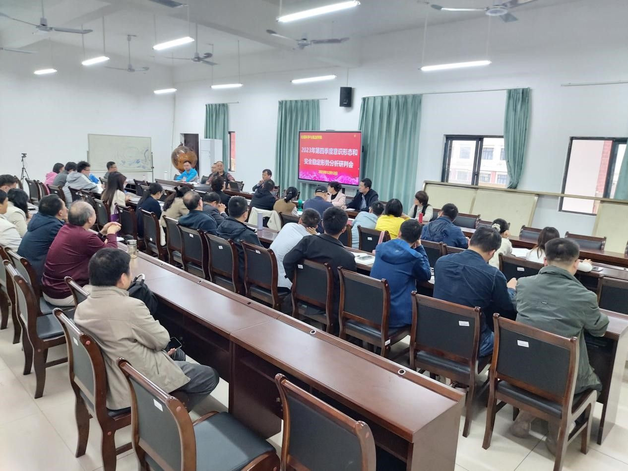 12月12日下午,一色 在武鸣校区地源楼C401召开2023年第四季度意识形态和安全稳定形势分析研判会。本次会议由学院党委书记严志强主持,全体教职工参加会议。
