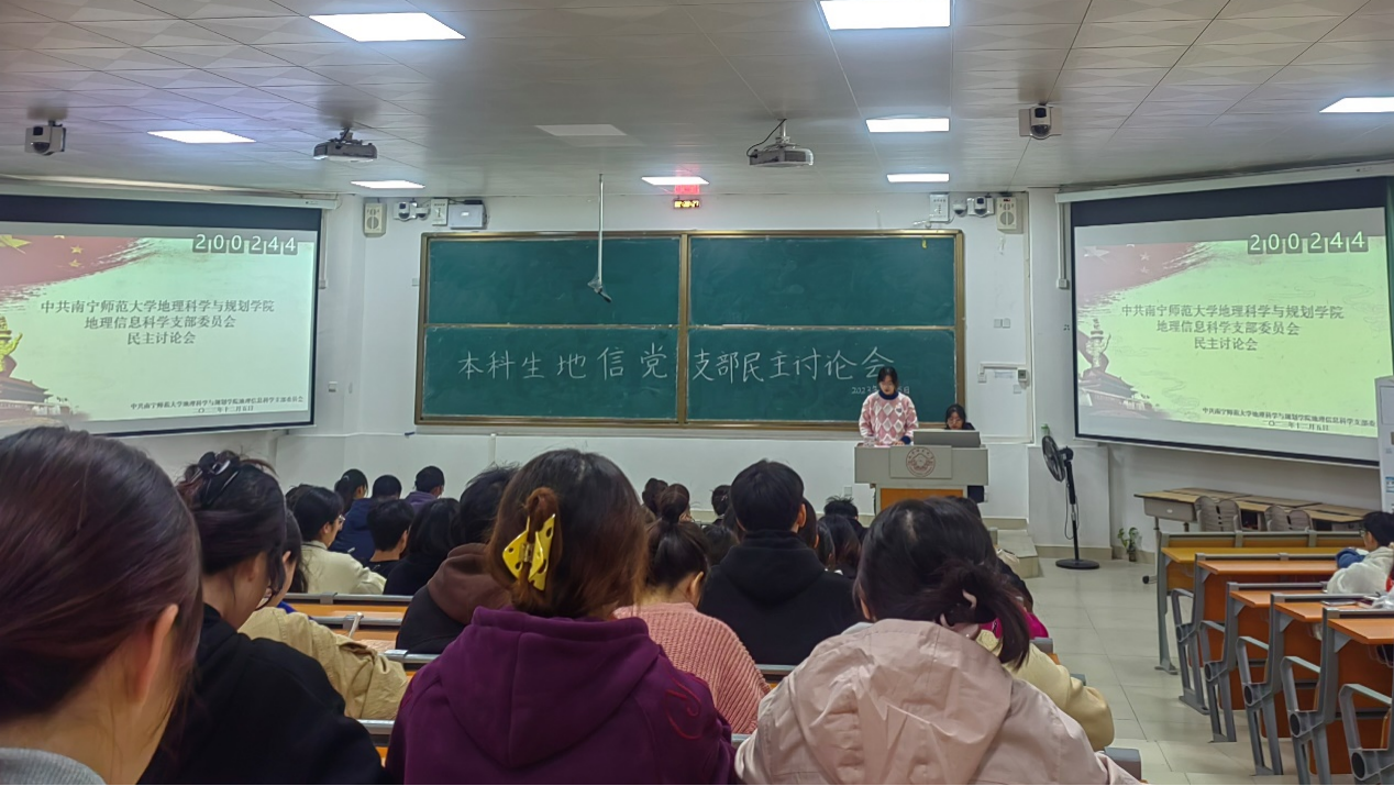 2023年12月5日星期二,一色 本科生地信党支部在一色 武鸣校区2号教学楼109教室如期召开民主讨论会。本次会议由綦文嘉同志和张子涵同志主持,本科生地信党支部全体党员和各班积极分子共同参会。