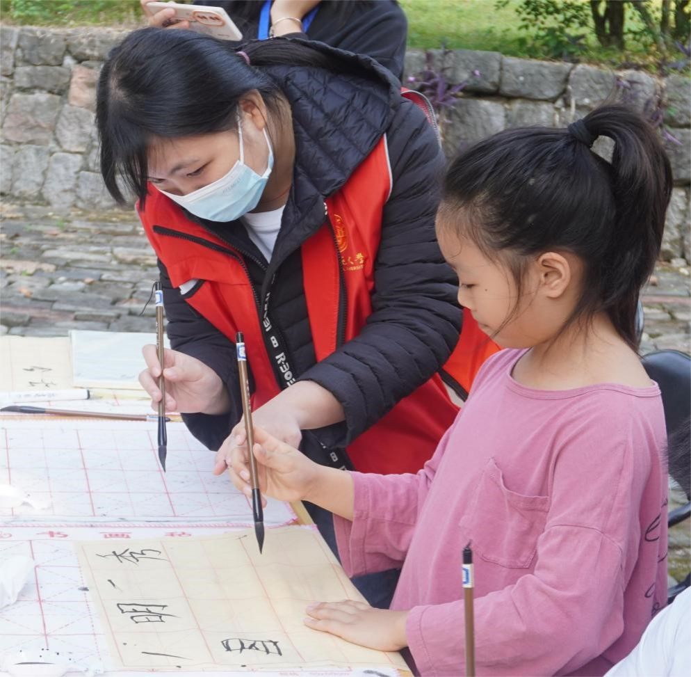 (志愿者教导小朋友用毛笔写汉字)