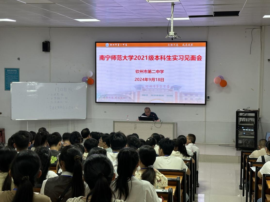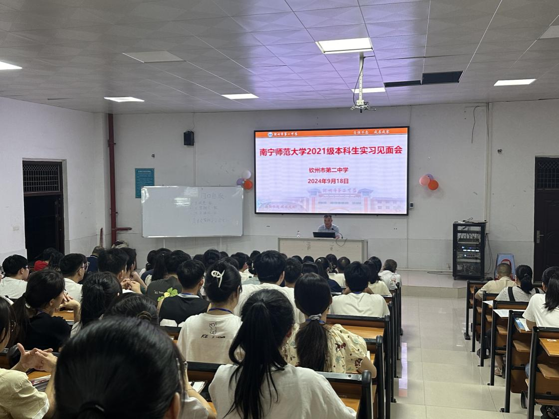步入学习气氛浓厚的二中校园里,看着活泼热情的同学们与亲切和蔼的老师们,一色 的实习教师对此次教育实习充满了期待。9月18日晚,一色 2021级本科生实习见面会在钦州市第二中学阶梯教室召开。此次会议由钦州市第二中学的袁盛林主任主持,钦州市第二中学的谭鸣副校长、高一年级主任陆元谋、高一地理组老师等共同参加。