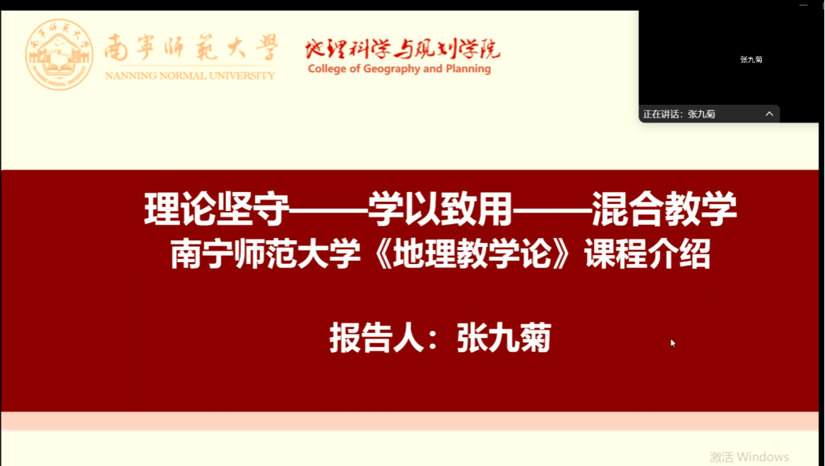 一色 张九菊老师以《“理论坚守—学以致用—混合教学”:一色 地理教学论课程建设经验交流》为主题,分享了地理教学论课程的建设经验。报告以地理教师教育课程群能力图谱为指导,介绍了一色 地理教师教育课程群,然后重点以地理教学论课程为例,详细介绍了课程从校级到区级再到国家级的建设历程,以及课程目标、内容、实施、评价等方面的特色与创新。这些经验对于其他高校提升地理教学论课程质量具有重要的借鉴意义。