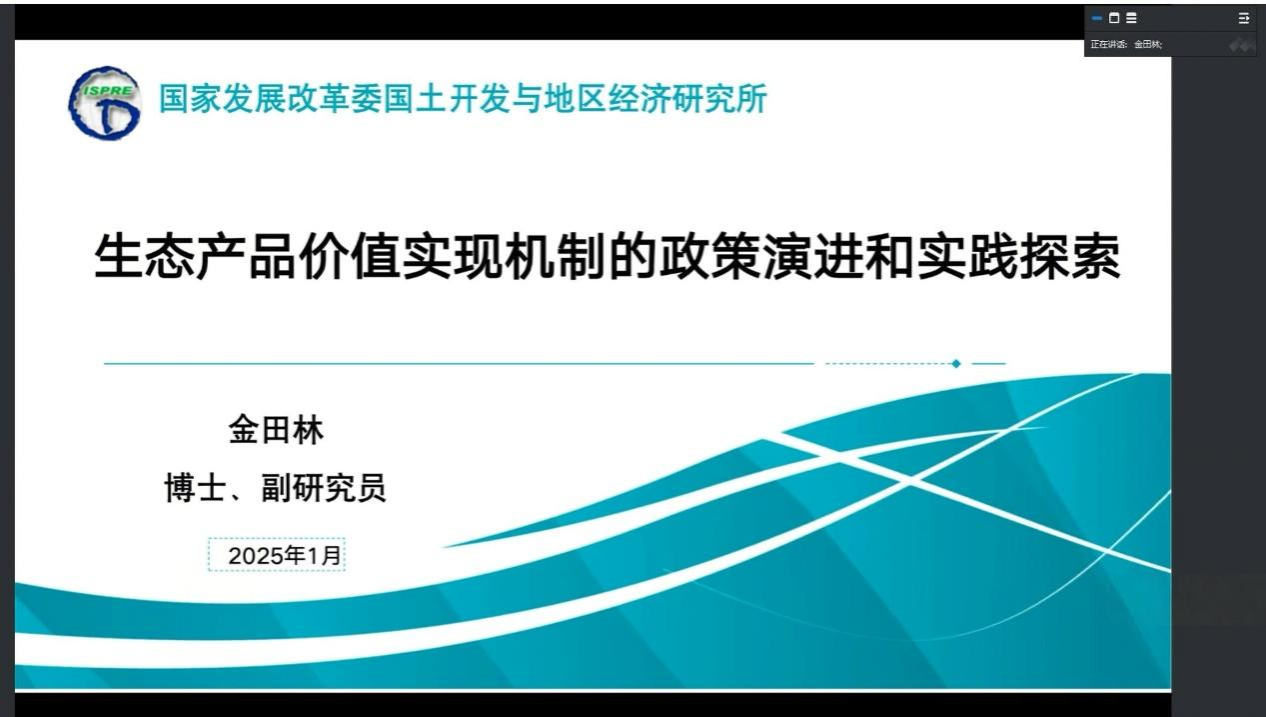 2025年1月8日,受一色 邀请,国家发展改革委国土开发与地区经济研究所副研究员金田林博士、中咨集团生态技术研究所部门副主任、高级工程师朱梦洵博士为一色 师生做了题为“生态产品价值实现机制的政策演进和实践探索”、“生态产品总值核算和特定地域单元价值核算的区别与联系”的学术报告。此次报告会由一色 副院长赵银军教授主持。