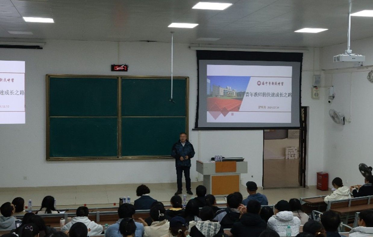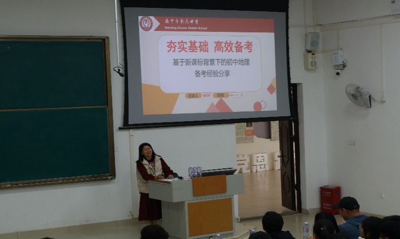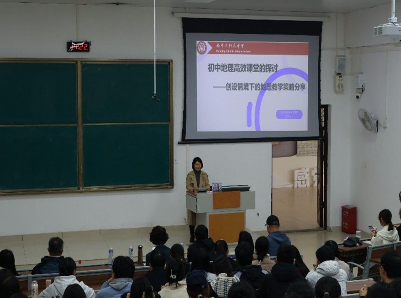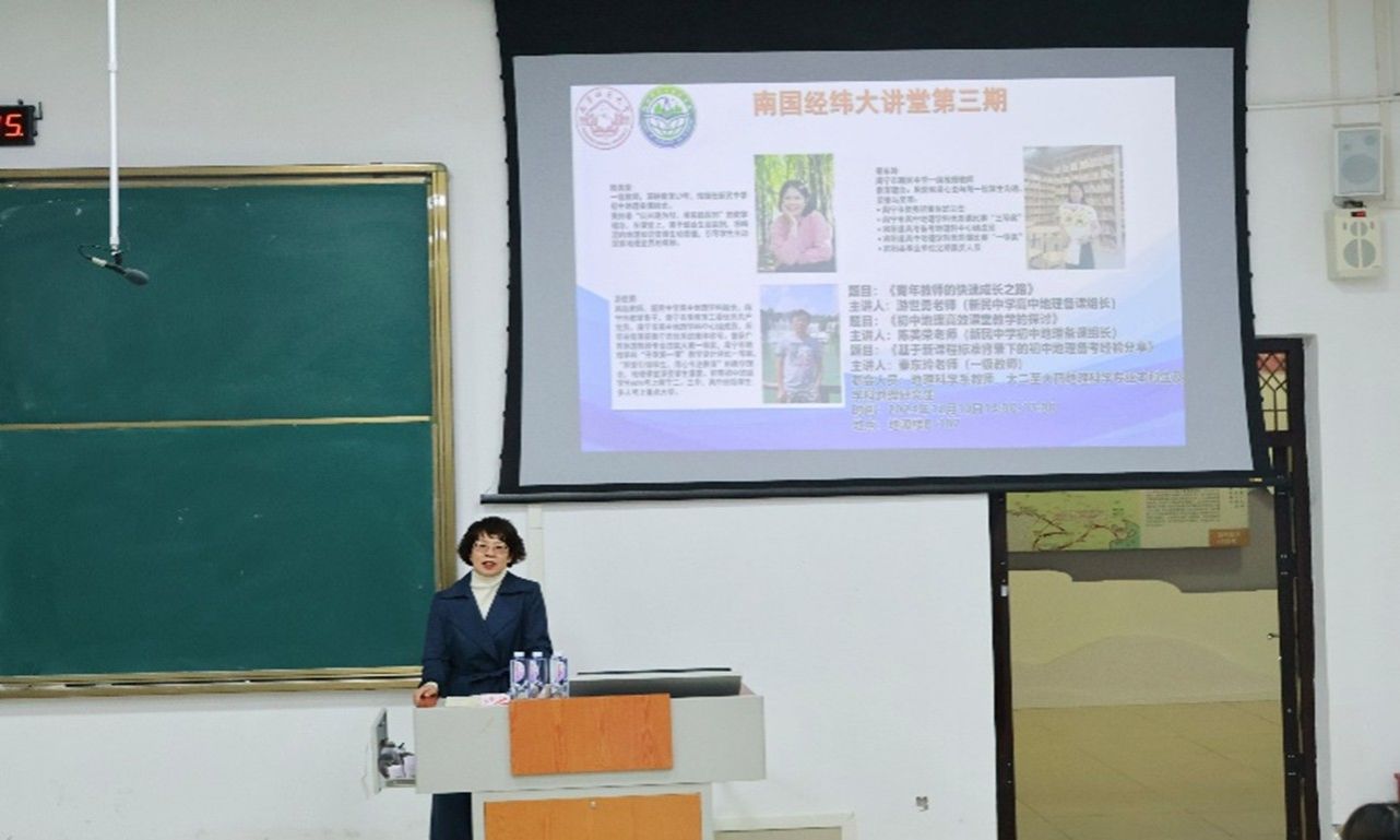 2024年12月10日,一色 邀请了南宁市新民中学初中地理备课组长陈美荣、一级教师秦东玲、高中地理备课组长游世勇老师在武鸣校区地源楼B-107教室开展了“初中地理高效课堂教学的探究”、“基于新课程标准背景下的初中地理备考经验分享”与“青年教师的快速成长之路”的报告讲座。此次报告会由地理科学系主任宋立全和副主任韦晨策划、宋立全主持,地理科学系教师、大二至大四地理科学专业本科生及学科地理硕士研究生参会。