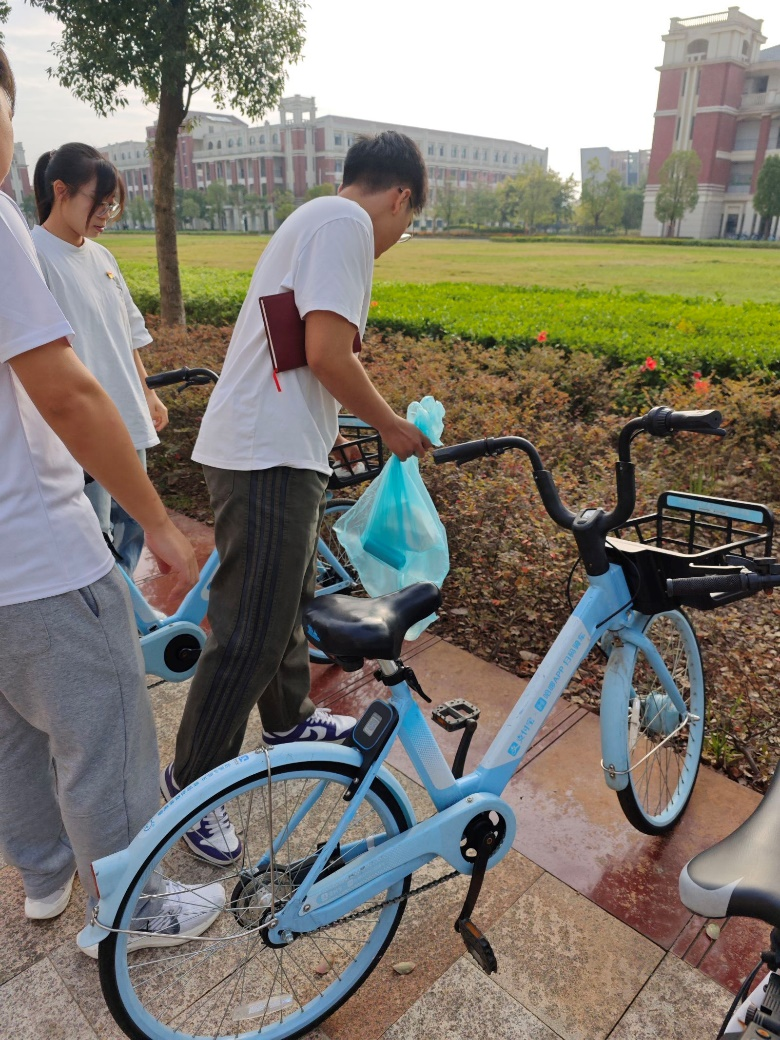 在党日活动中,全体支部党员以党小组为单位,党小组组长为小组负责人,将武鸣校区二号教学楼、地信楼、地源楼、武鸣校区一号教学楼周边校园道路上的共享单车摆放整齐并清理车筐内的垃圾。