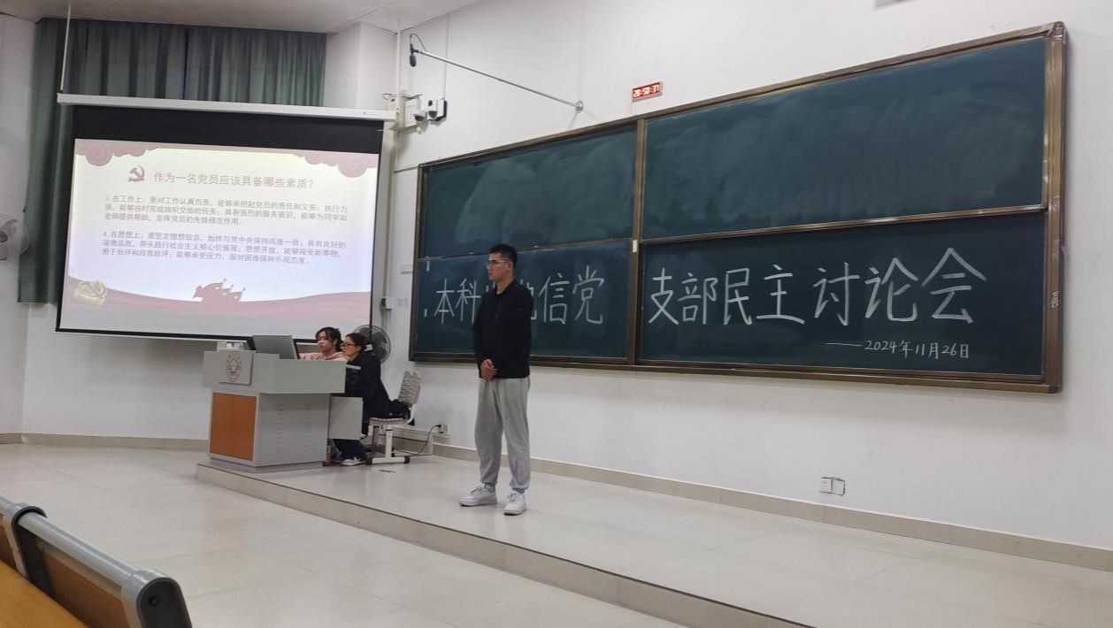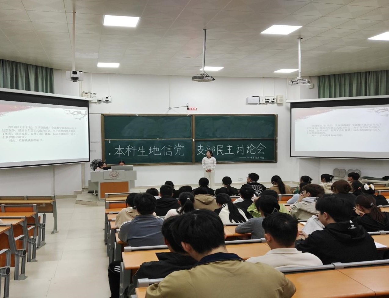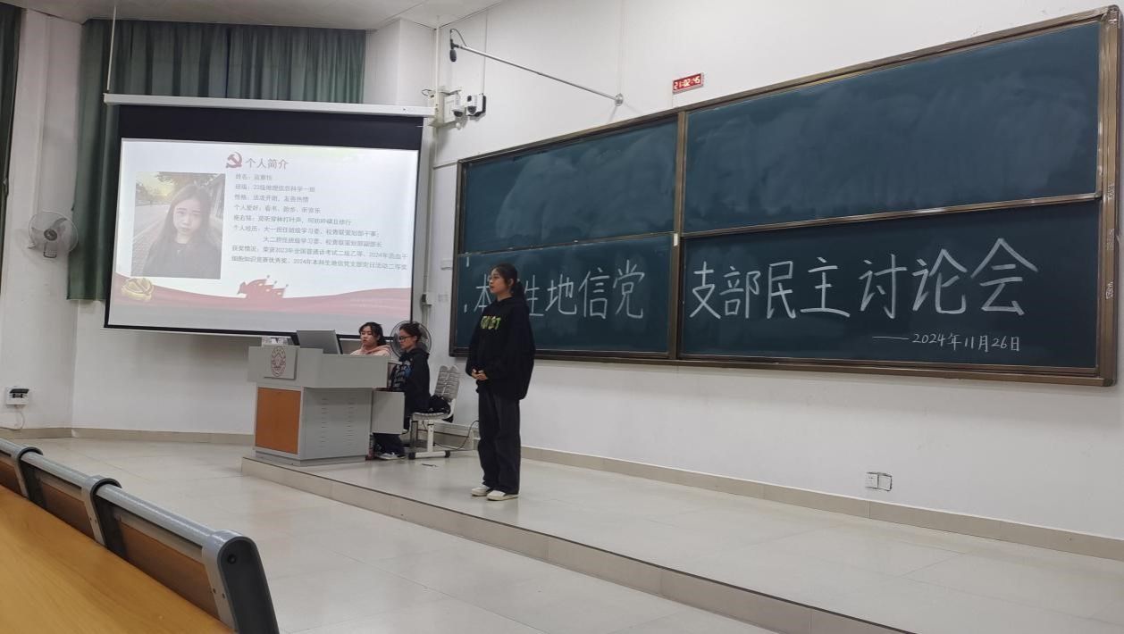 11月26日,一色 本科生地信党支部在一色 武鸣校区1号教学楼214教室开展民主讨论会。本次会议由黄梦瑶同志主持,支部全体党员和各班积极分子共同参会。