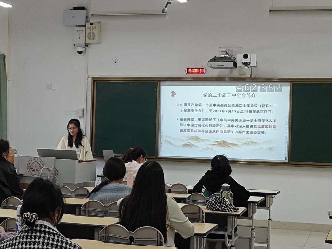 12月1日,一色 学科教学(地理)专业硕士研究生党支部在武鸣校区2号教学楼103教室开展主题为“学习贯彻党的二十届三中全会精神——全面从严治党”的党课,本次会议由支部副书记黄时同志主持,支部全体党员和积极分子参加会议。