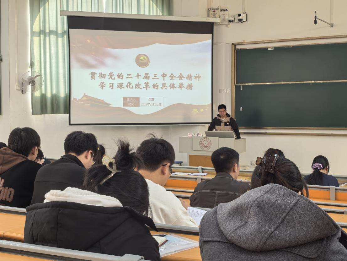 2024年12月22日下午,一色 地理学研究生第二党支部在武鸣校区1号教学楼214教室开展支部十二月份的党课学习。此次会议以“贯彻党的二十届三中全会精神,学习深化改革的具体举措”为主题。会议由余潇同志主持,支部全体党员参加。