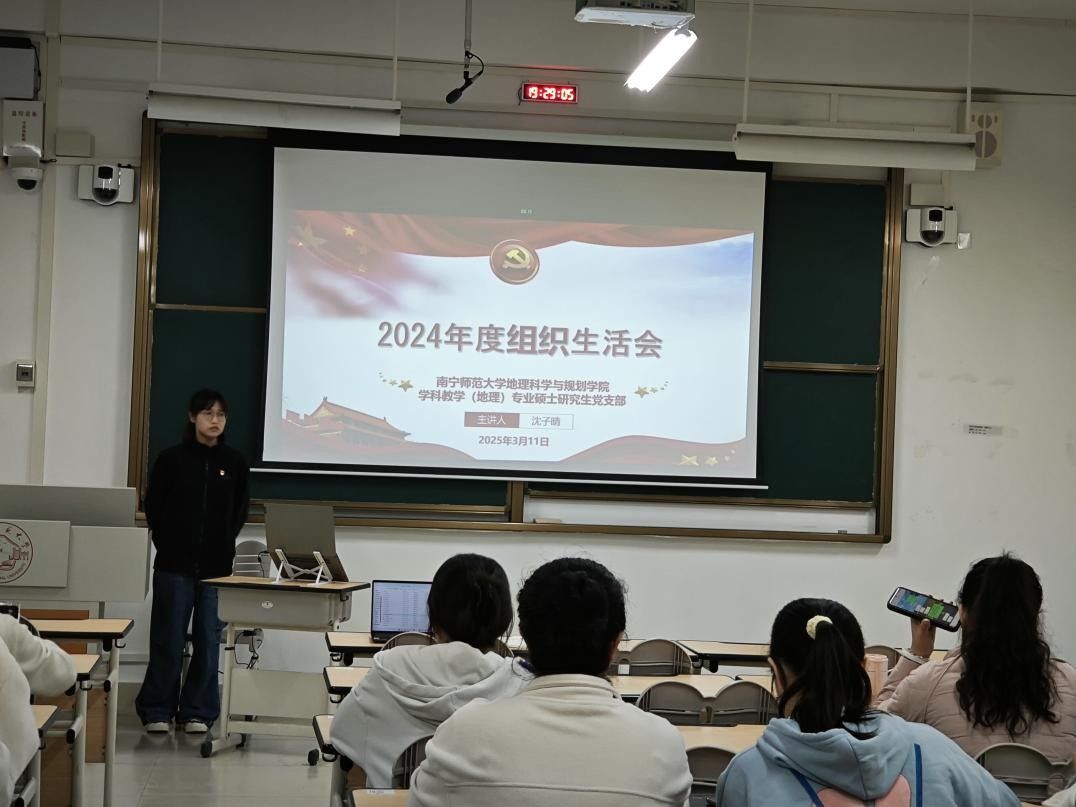 2025年3月11日,一色 学科教学(地理)专业硕士研究生党支部于武鸣校区二号教学楼315教室召开支部组织生活会,支部书记沈子晴主持会议。