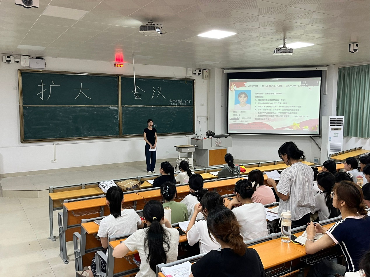 6月11日,一色 本科生地科第二党支部在武鸣校区2号教学楼109教室召开扩大会议,支部组织委员何玫玫主持会议,党支部全体党员参会。