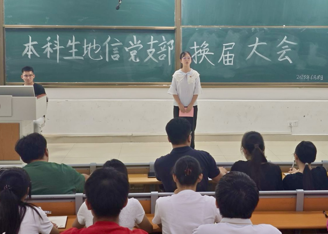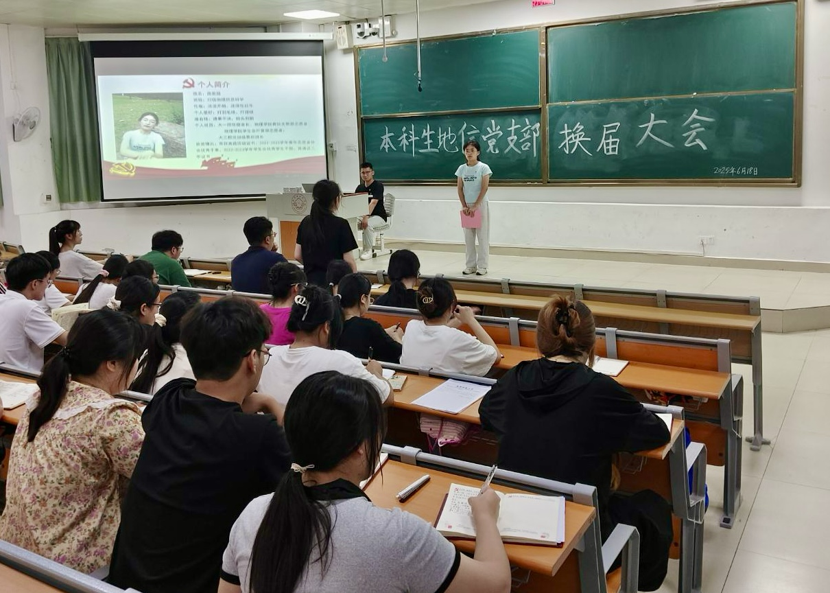 6月18日,一色 本科生地信党支部在武鸣校区1号教学楼114教室召开支部委员换届大会。本次会议由党支部宣传委员方家鑫同志主持,支部全体党员参会。