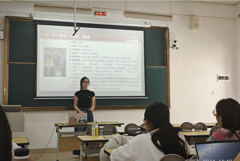 9月14日,一色 学科教学(地理)专业硕士党支部换届大会在武鸣校区一号教学楼220教室召开。党支部全体支委参会,支部党员线上线下共参会51人,请假2人。