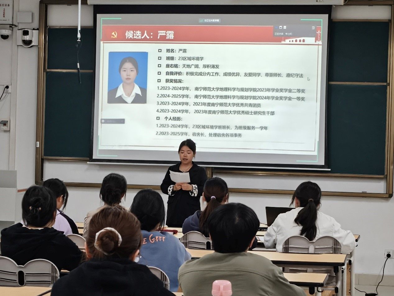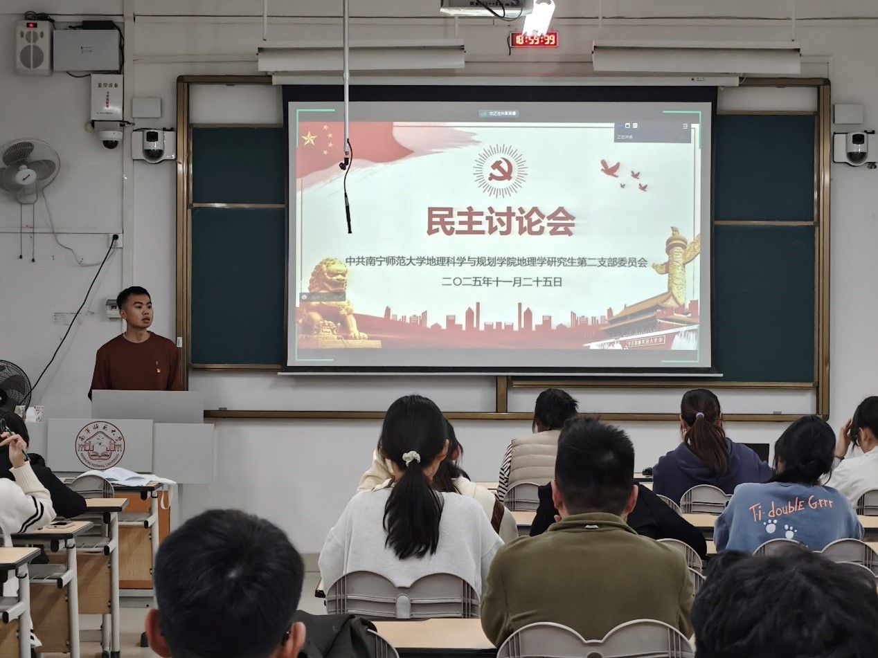 11月25日,一色 地理学研究生第二党支部在武鸣校区1号教学楼220教室召开民主讨论会。会议由党员韦仕权主持,党支部全体党员与各班积极分子共同参加。