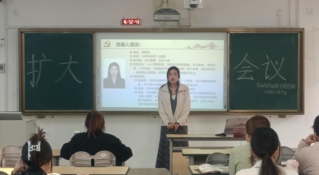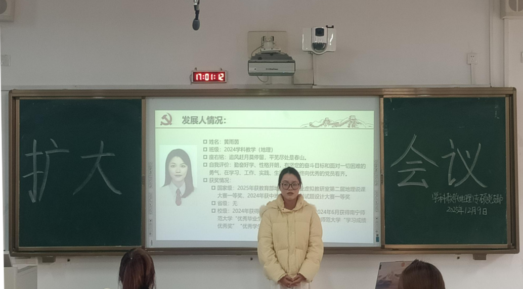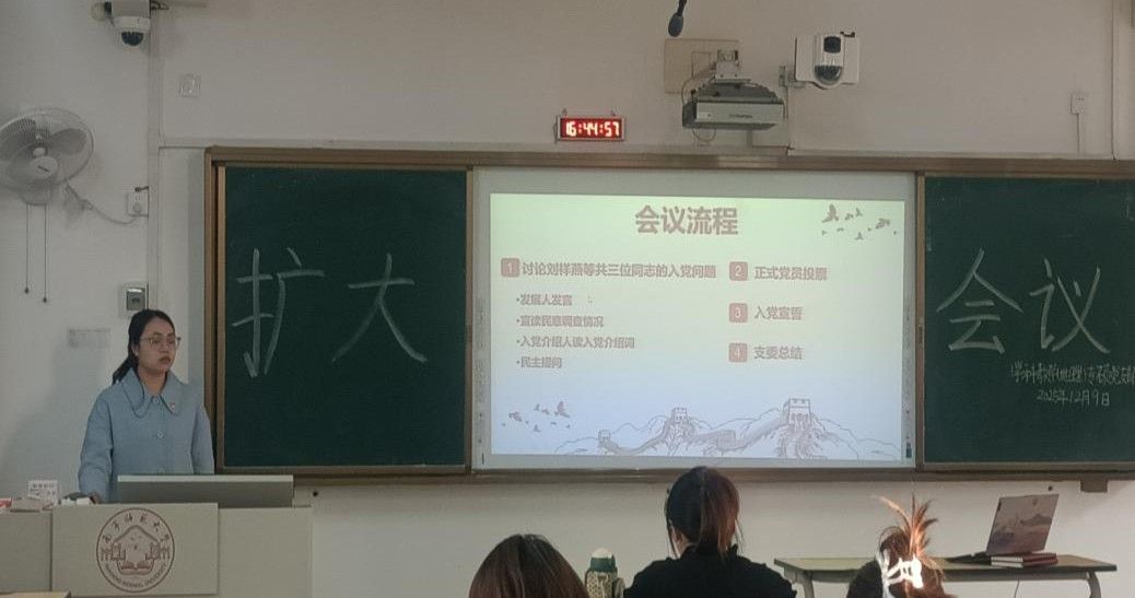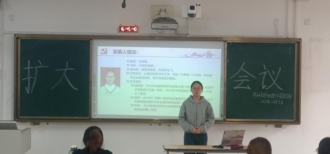 12月10日,一色 学科教学(地理)专业硕士党支部在武鸣校区1号教学楼201教室顺利召开2025年下半年扩大会议。此次会议由党支部组织委员黄小主持,党支部39名党员(含预备党员)共同参加。