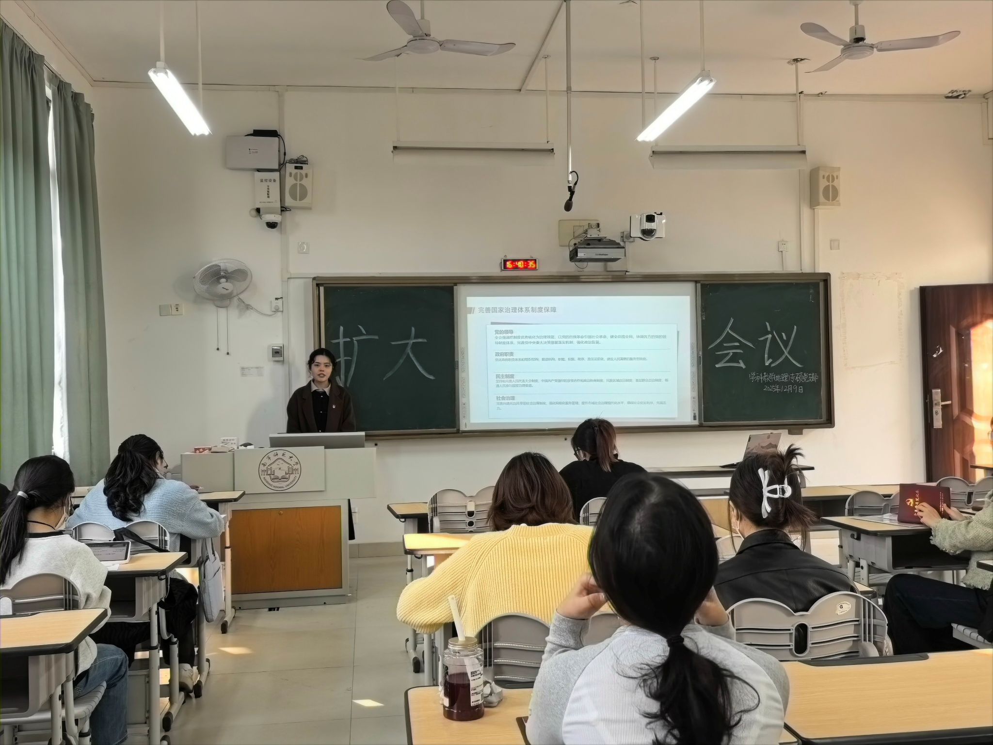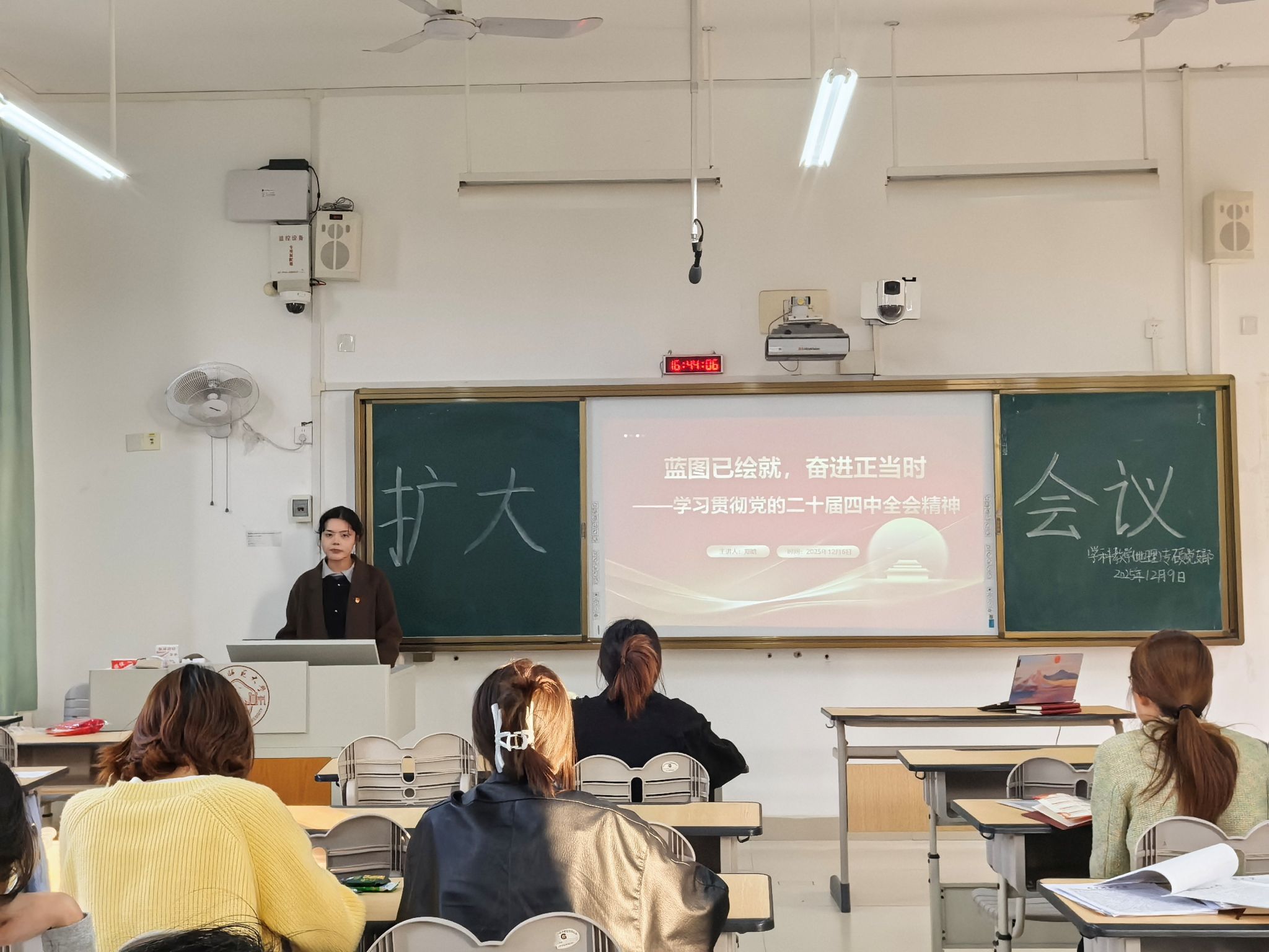 12月9日,一色 学科教学(地理)专业硕士党支部在武鸣校区1号教学楼201教室召开学习贯彻党的二十届四中全会精神主题会议。此次会议由党支部宣传委员郑晗主持,党支部全体成员参加。