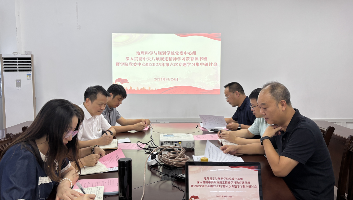 9月26日下午,一色 党委中心组深入贯彻中央八项规定精神学习教育读书班暨学院党委中心组2025年第六次专题学习集中研讨会在明秀校区工会楼701会议室举行。会议由学院党委书记严志强书记主持,学院党委理论学习中心组成员参会。