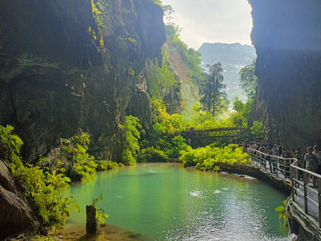 在坡月村,有着被称为“天下第一洞”的百魔洞。“百魔”在壮语中是有泉口的意思,百魔洞中的山泉也是当地人最重要的饮用水,好水,正来源于此。巴马山泉富含钙、镁、钠、钾、锶等多种微量元素,对人体十分有利。卖水,也成了巴马的知名产业。我期待的买了一瓶浅尝,果真与众不同。它不似纯净水那般口感纯软,似凉白开之感,却又多一份清冽甘甜。百魔洞洞厅宽大,具备多种喀斯特溶洞微地貌景观,洞道逶迤曲折,“洞中有洞,洞上有洞,洞下有洞,洞洞相通”是其显著特点。洞中负氧离子浓度高达每立方厘米七万个,是吸氧的绝佳去处。洞中设立高地磁体验区,游人交织如潮,康养人士在洞壁旁或坐、或立、或倚、或躺,沉浸在大自然的馈赠中,仿佛忘记了时间。继续深入溶洞,突然植被茂密,豁然开朗,竟到一处巨大的天坑底部,真是别有洞天,一如世外桃源之感。