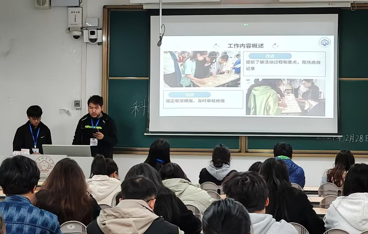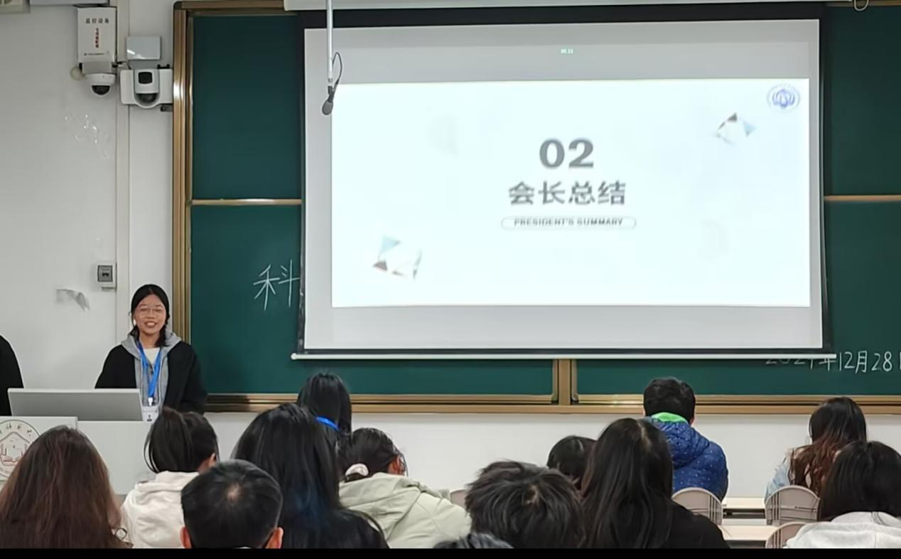 活动伊始,主持人沈乐简要介绍本次例会的目的和流程。随后,按照创赛部--活动部--宣传部--秘书处的顺序,各部门汇报人依次上台进行发言,详细地总结本学期的部门工作,反思了当前存在的问题与不足,并提出了切实可行的改进措施以及接下来的活动安排。最后,科协会长陆秋百进行整体的工作总结,对各部门在工作中取得的成绩表示肯定,同时指出了一些不足,如在给各班班长转发工作通知前先核对好信息减少不必要的删改等,为今后的工作改善指明了方向。此外,陆秋百还鼓励成员们好好复习,争取在期末中取得好成绩。